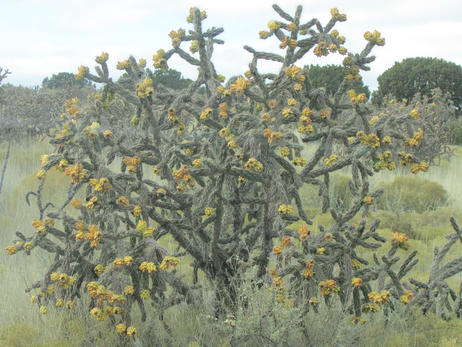 Went out on the desert about a week ago and it was cloudy for a chance instead of the blue sky days we normally have. Most are pics of juniper trees or cholla (pronounced cha-ya), one with a lot of yellow fruit on it from last spring. A couple of shots of the Sandia Mountains that are about 60 miles to the east of where we were with the city of Albuquerque between us and the mountain. From here the mountain looks like just a big rock but up close you can tell it is covered in pine trees. First pic is of a strange peak to the west of where we were maybe another 50 miles. One pic is of a deer hoof print and it was very fresh. Maybe we chased the deer away but we didn't see it. One shot of an arroyo that we didn't manage to get across even though we could tell recent rains and made a mess of it. There were several other arroyo that were in a lot worse shape and we just turned around and backtracked to a different dirt road. Last shot is on the way home with the sun trying to shine through the clouds as it went down.